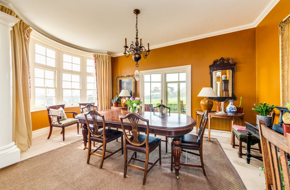 The drawing room is refined and inviting, with a brass chandelier, original window shutters and an elegant fireplace. Sunlight pours in through the windows, which look out over the lawn and rows of daffodils. This space is made for quiet afternoons with a book or hosting friends and family after dinner.